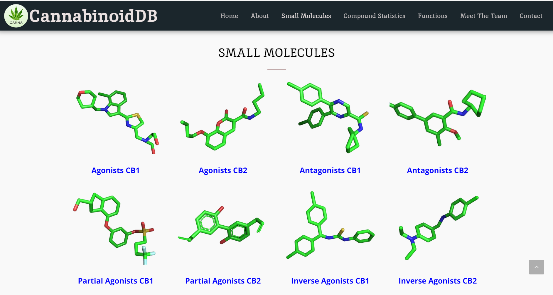 In the Small Molecules section of the Homepage, click on the type of small molecules you want to browse for, be it - Agonists of CB1, Antagonists of CB1, Agonists of CB2, Antagonists of CB2, Partial Agonists of CB1, Partial Agonists of CB2, Inverse Agonists of CB1 and Inverse Agonists of CB2.