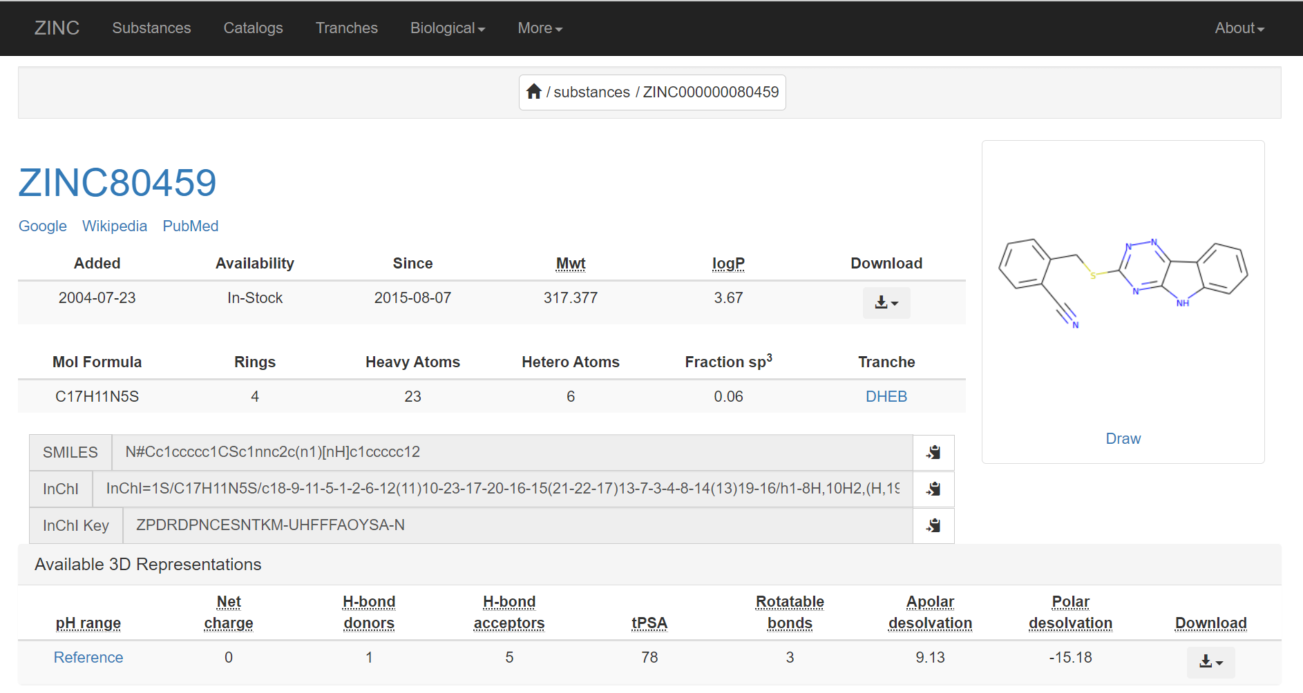 To have more information about the molecule from the ZINC database, click on the clickable ZINC ID link.