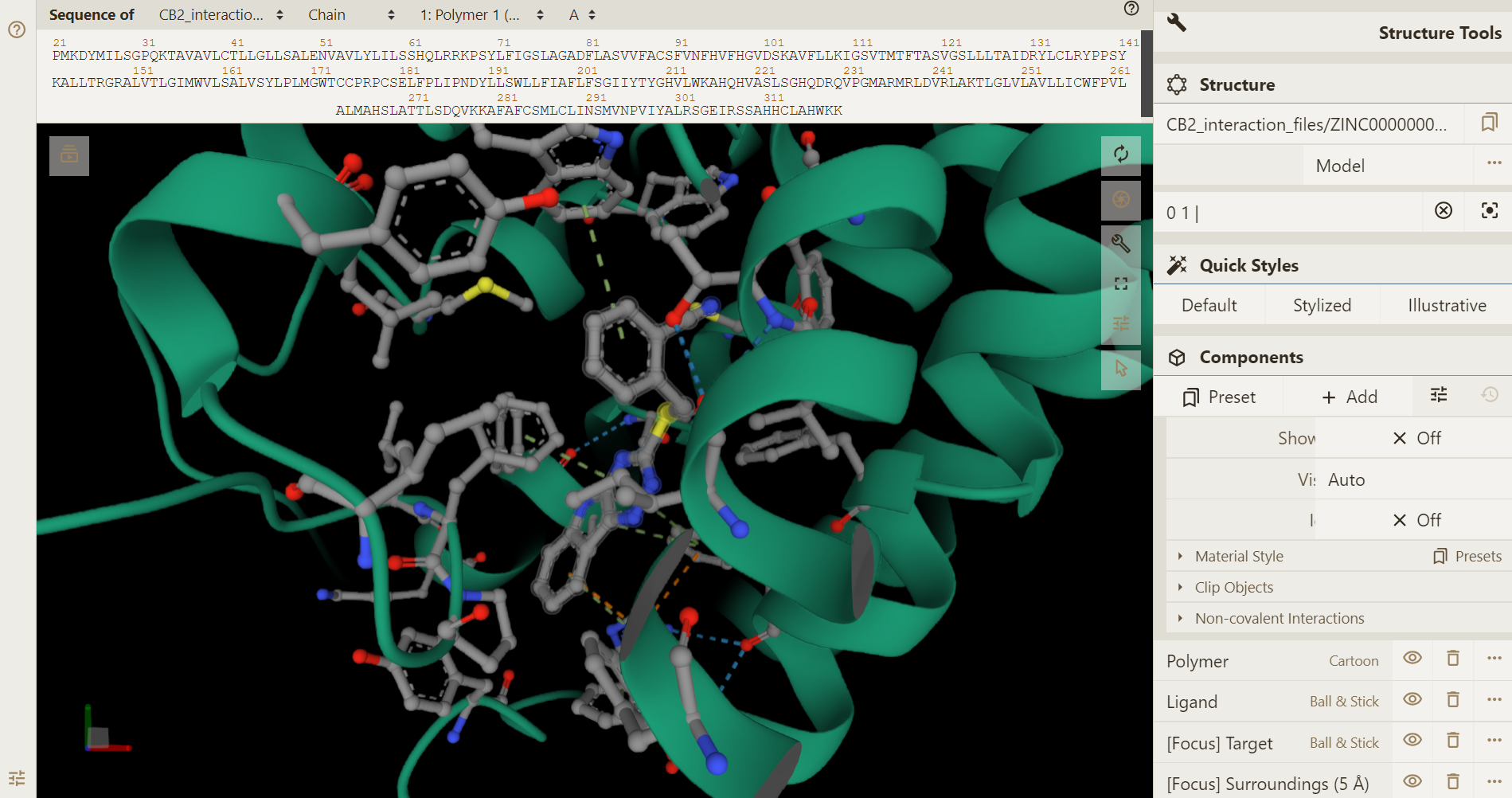 To view the interactions of the molecule with the chosen receptor in the Mol* plugin window, click on the ligand molecule directly.