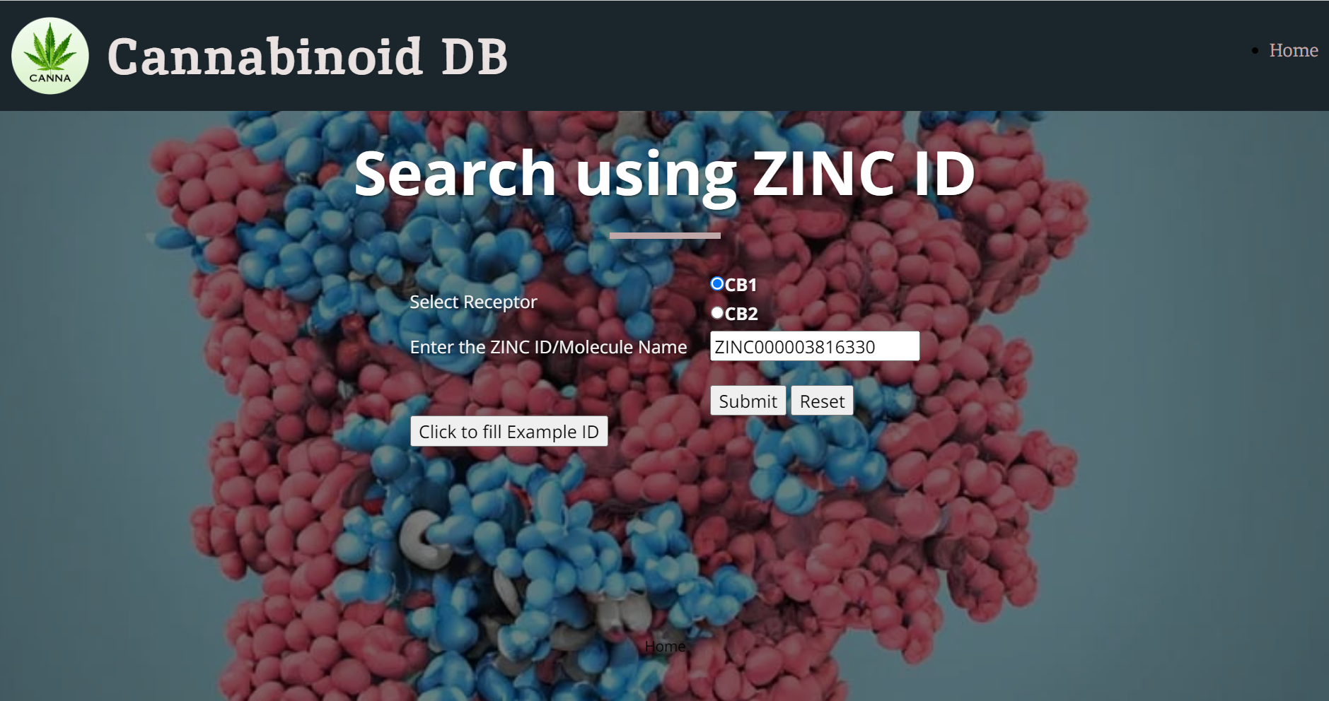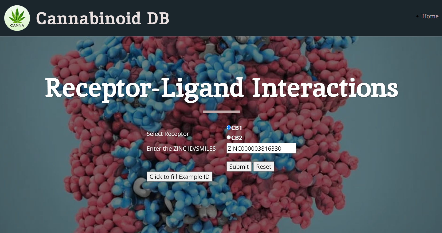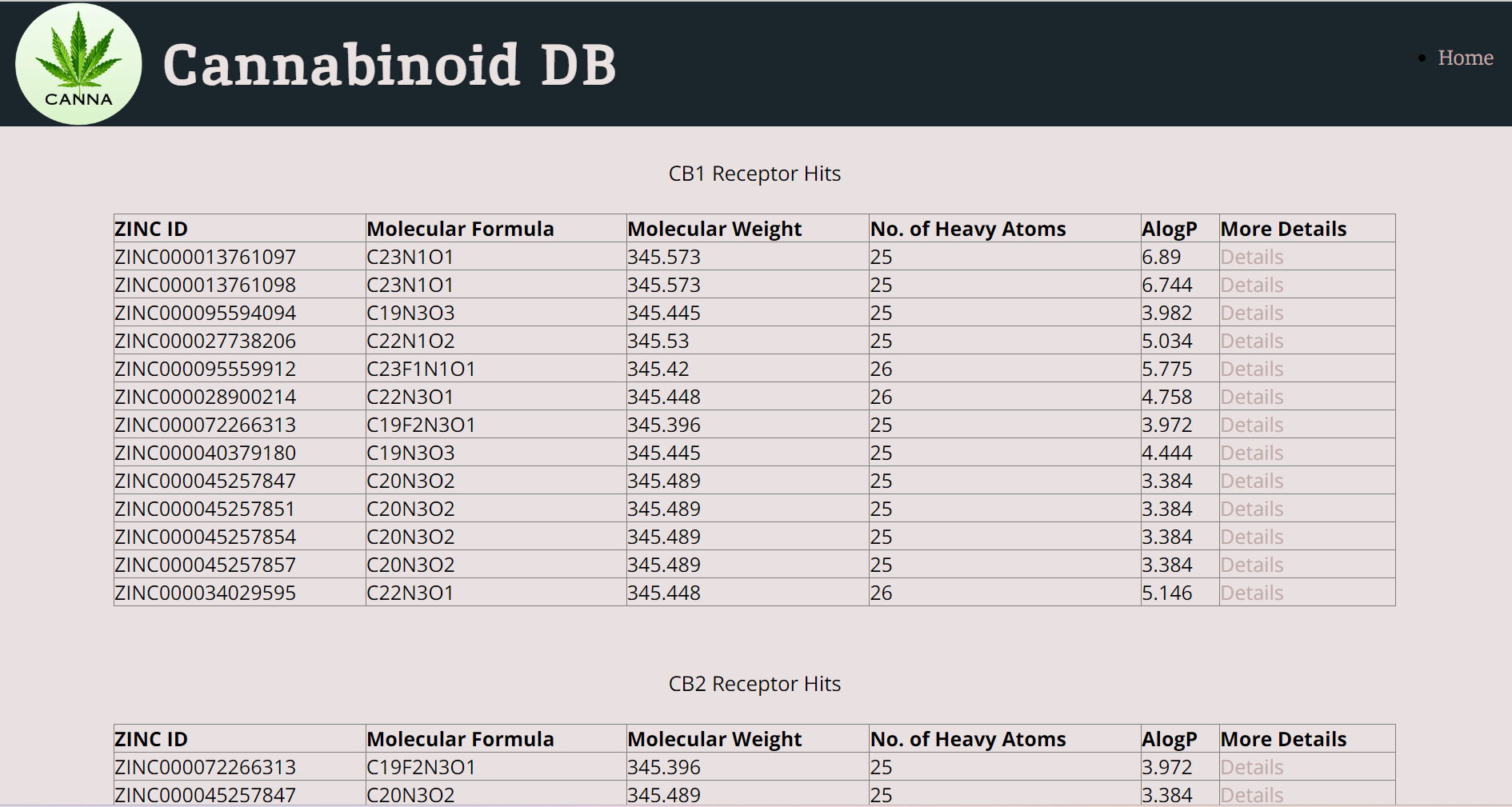 CannabinoidDB has a simple and user-friendly interface for querying and browsing molecules. Visualizations of all the molecules in the receptor’s binding site are provided to understand relevant interactions. CannabinoidDB allows the user to interactively browse through the pages to access corresponding molecules and subsequently obtain details of the molecules along with their interaction details.